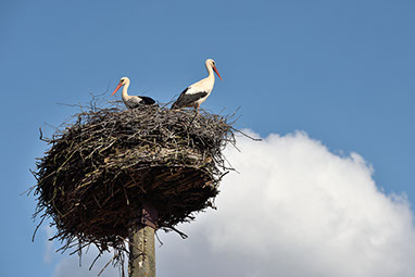 Meister Adebar genießt ein landesweites Schutzprogramm des LBV. Der Landkreis Günzburg ist ein Paradebeispiel für den Erfolg und so ist unser Landkreis mit der storchenreichste in ganz Bayern. Und jeder Horst hat einen „Leibwächter“. Unsere Storchenbetreuer registrieren alljährlich Ankunfts- und Abflugdatum, Brutbeginn, Anzahl Jungvögel etc. Deutlich über 20 Brutpaare können wir jährlich verbuchen. Und regelmäßig kommen weitere dazu. So ist auch jedes Flusstal besiedelt. Die höchste Dichte erreicht der Weißstorch jedoch im Mindeltal. Dort können nahezu in jeder Ortschaft Weißstorch-Brutpaare beobachtet werden. In den meisten Fällen brüten unsere „Weißen“ auf Kunsthorsten, doch insbesondere die Werbetürme im Scheppacher Industriegebiet verlocken auch zum eigenständigen Nestbau.